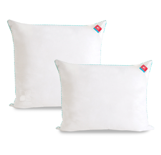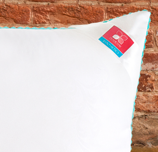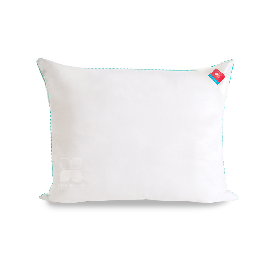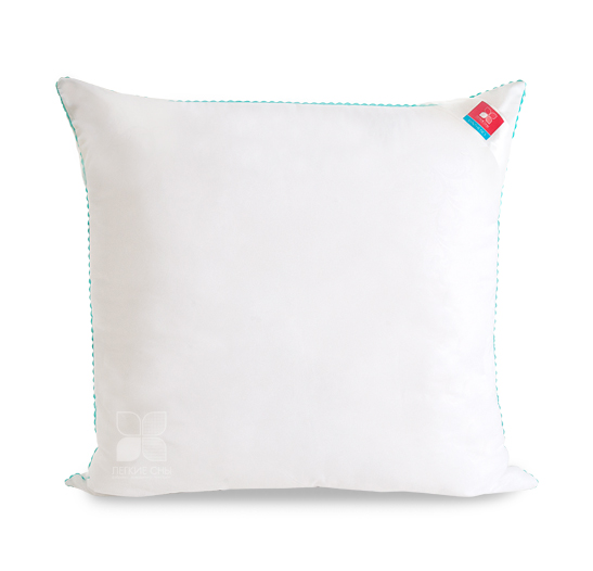 Важно заметить, что синтетический пух столь же лёгок и приятен на ощупь, как и его натуральный прототип. Чехол подушки выполнен из микрофибры (100 % полиэстр) белого цвета с тиснением страйп или волны, отделка по краю подушки кантом зиг-заг бирюзового цвета, фирменная упаковка конверт ПВД, спанбонд.